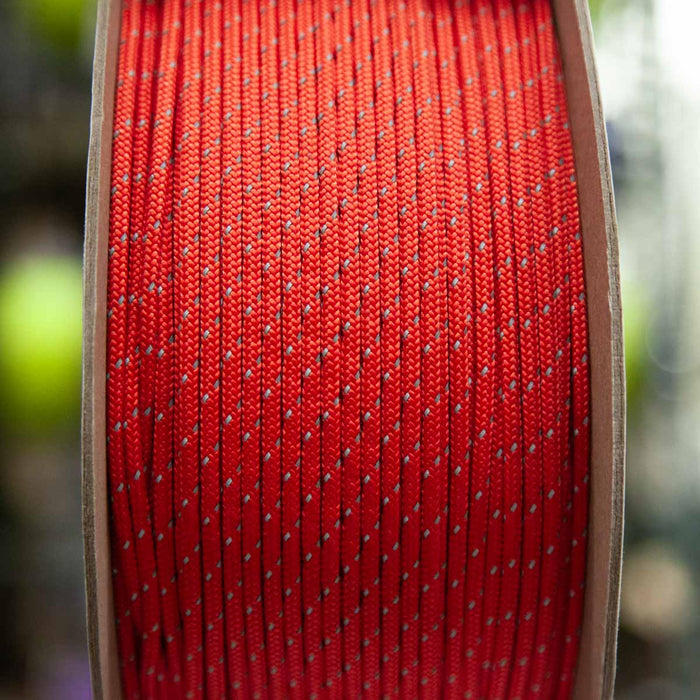 3mm Diameter red nylon cord with one reflective tracer line running through it.